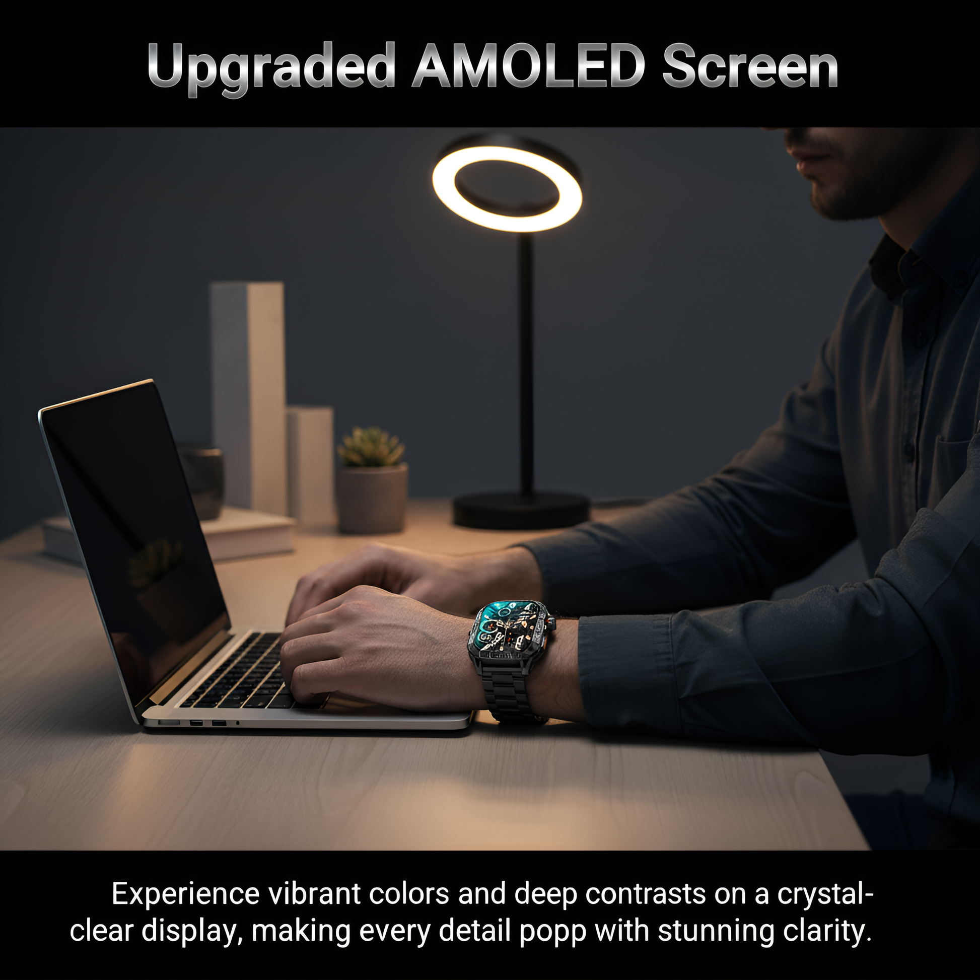 • Upgraded AMOLED Screen: The smartwatch has a 1.95-inch HD AMOLED touchscreen that shows bright and colorful pictures, even in sunlight. You can always see the time because the screen stays on all the time, and it saves energy—up to 40% less power than other screens!